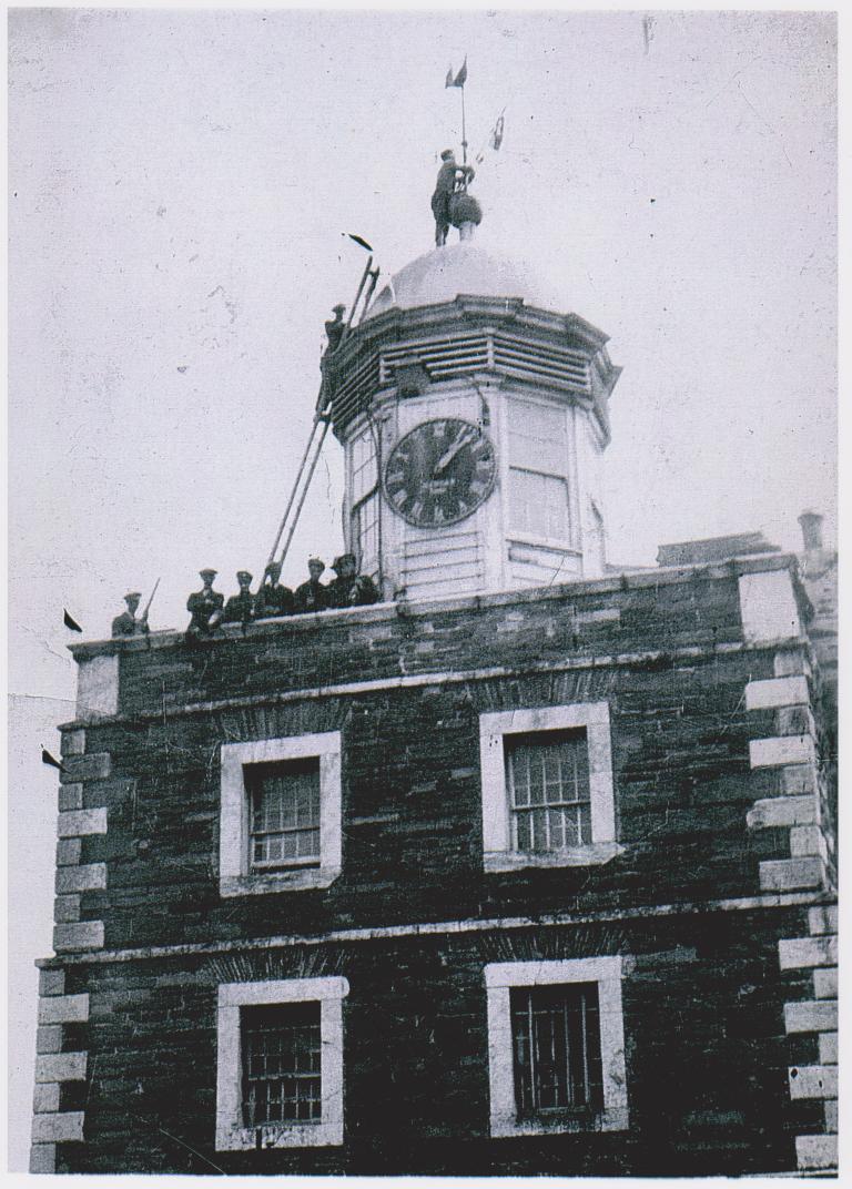 | The Free State forces taking down the I.R.A. flag -- after it had been put on the cock of the clock during the hours of darkness the previous night -- that was in 1923. |